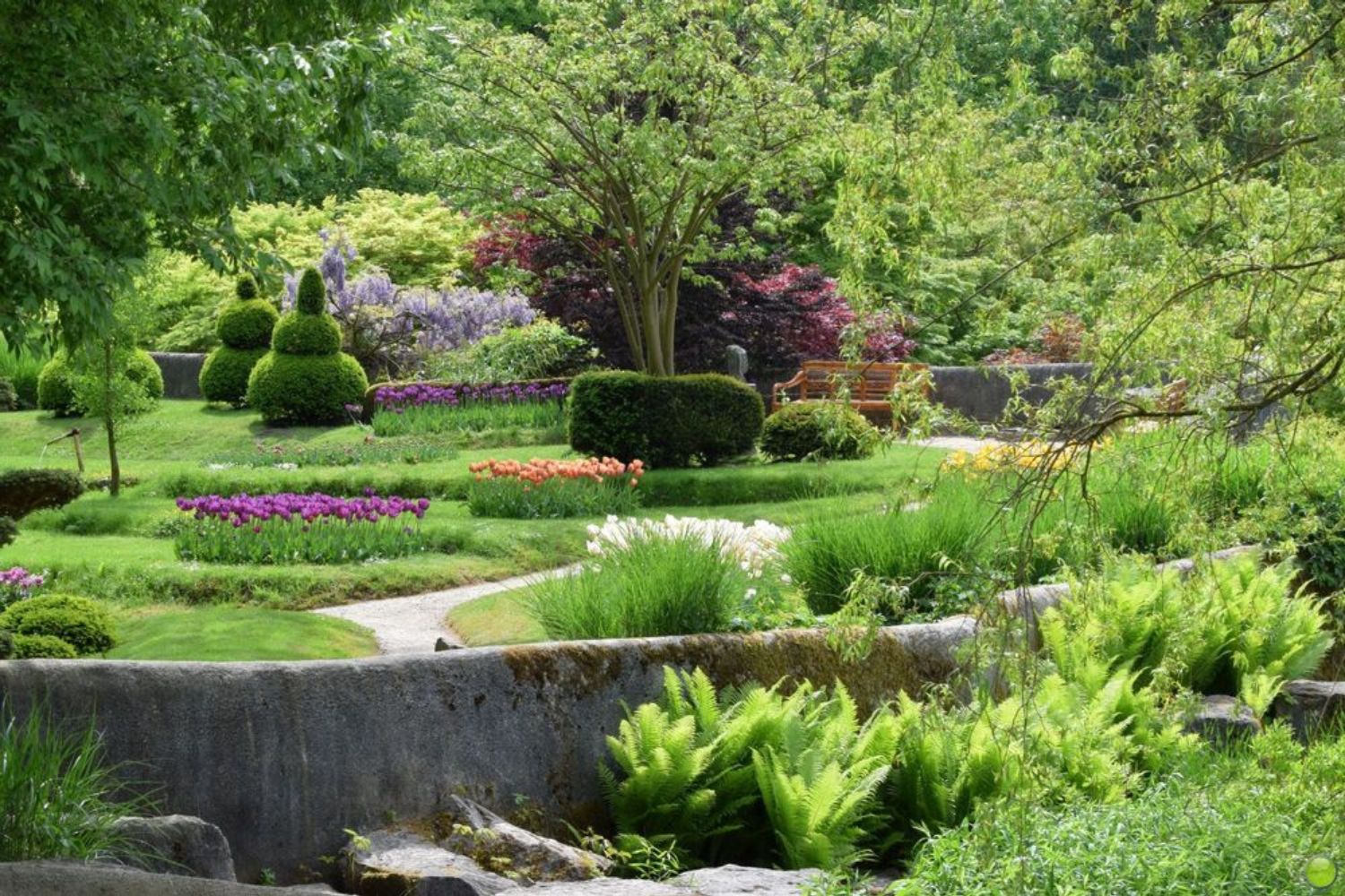 Daarna kan je de aangegeven route lopen en passeer je de andere tuinen, kabbelende stroompjes en watervallen. Er is veel afwisseling. Er staan hier en daar bankjes om af en toe te pauzeren. Overal waar je kijkt zie je liefde voor groen: de tuinen, waterpartijen en paden zijn met zorg onderhouden door een team van 7 hoveniers.