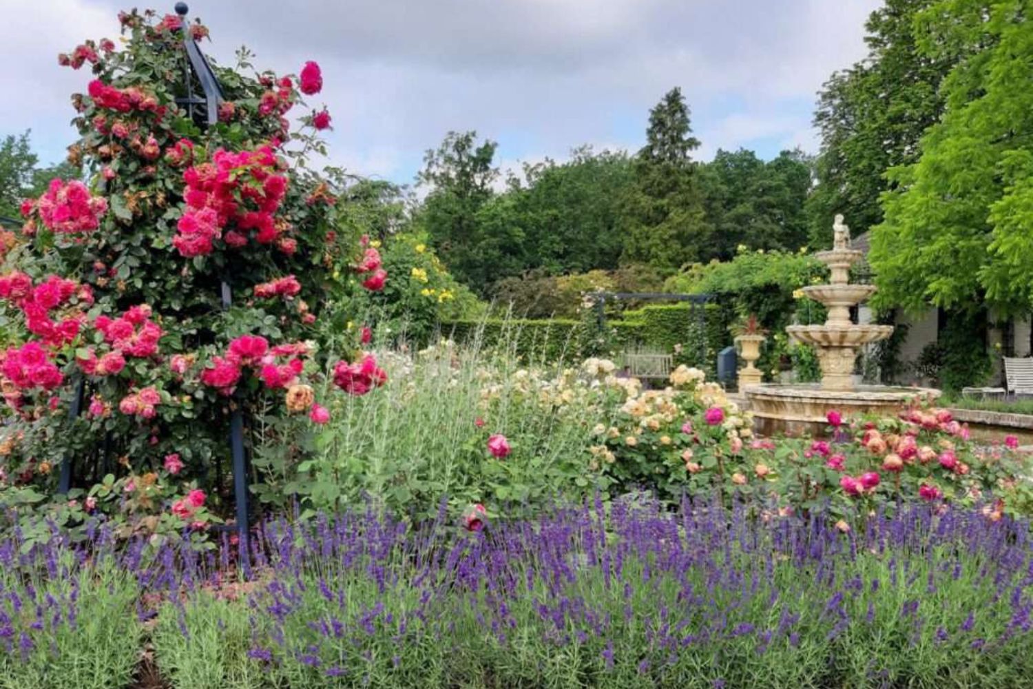 Elke tuin heeft zijn eigen karakter. Je maakt eerst kennis met het barokke Rosarium. In dit eerste deel van de tuinen staan meer dan 8000 rozenstruiken in 10 rozenkamers met verschillende thema’s. Als de rozen bloeien, vanaf ongeveer juni blozen ze in de zon, is deze tuin op haar mooist.