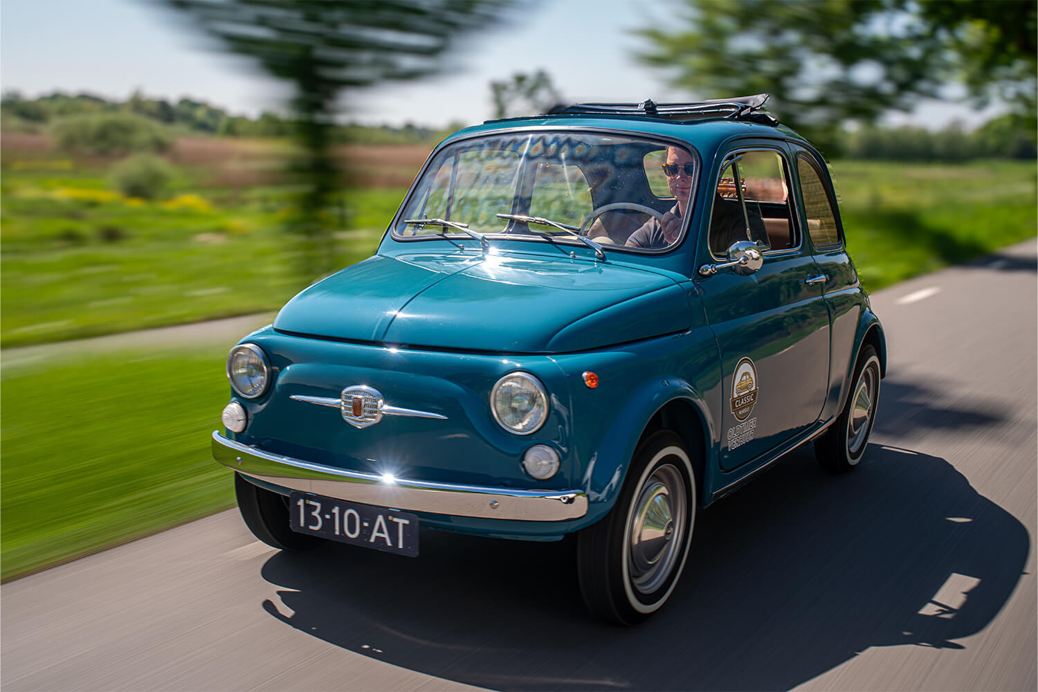 De Fiat 500 huur je al vanaf €175,- voor een halve dag, inclusief brandstof. Maak je reservering eventueel af door een picknickmand met heerlijke versnaperingen van topkwaliteit bij te boeken voor €35,-