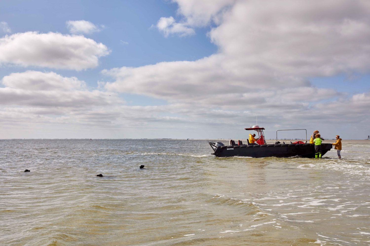 Vanaf het vasteland, bij Lauwersoog ga je, met reddingsvesten aan, het ruime sop op.
